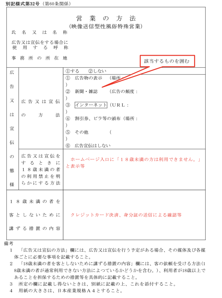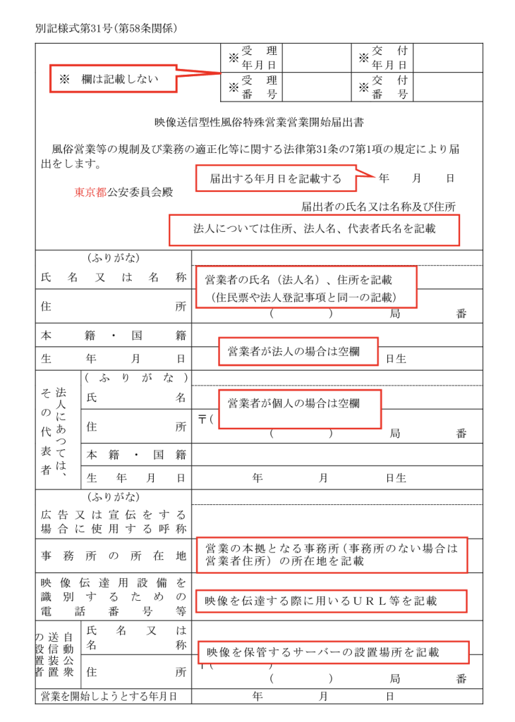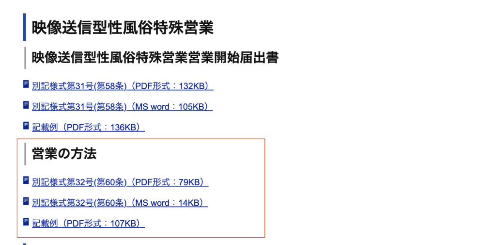 アダルト配信事業は、映像送信型性風俗特殊営業と風営法では定義されているので、以下のとおり「映像送信型性風俗特殊営業開始届」の様式をDLしてください。